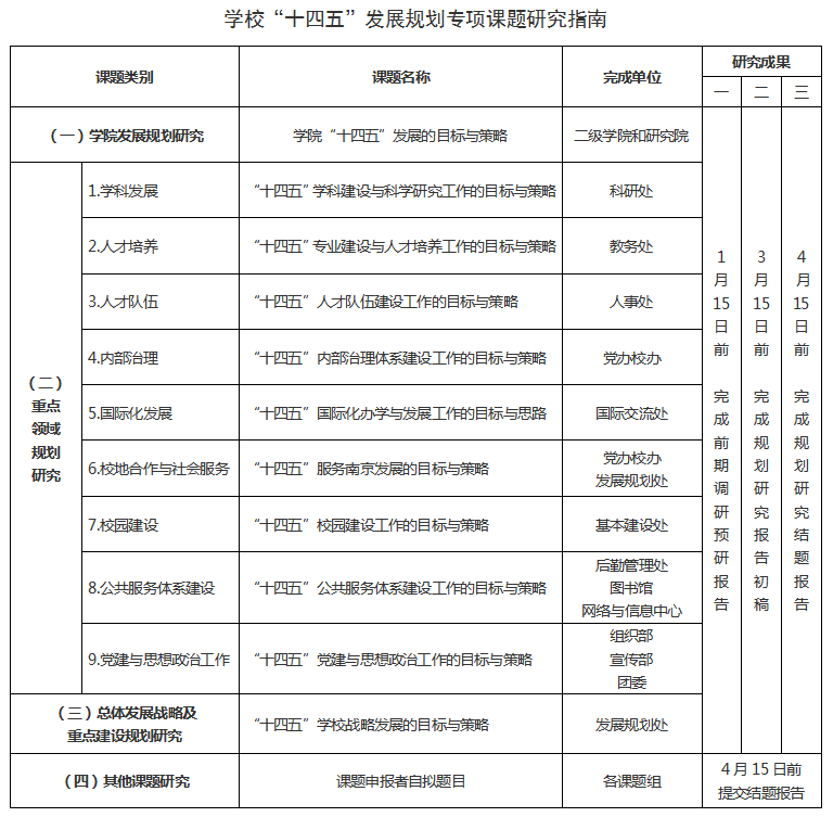 (一)各单位要高度重视“十四五”规划前期研究工作,原则上由各牵头单位主要领导担任课题主持人。同时建议安排具有一定研究基础、对学校相关工作较熟悉者为执笔人,确保课题按时保质完成。
